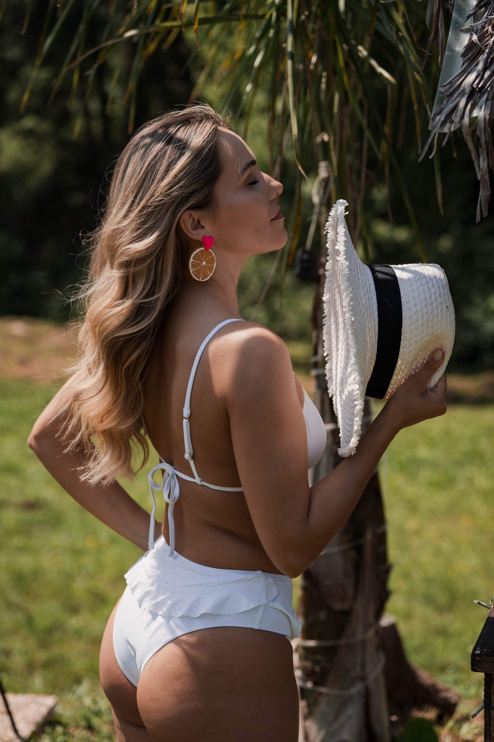 Parte baixo lisa subida com folho . Modelo atrás asadelta. S 34 M 36 L 38 XL 40, XXL 42. Modelo veste S. Disponível em preto e branco. Composição : 82% poliester , 18% elastano.